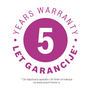 Kupcem (fizičnim osebam) vgradne pečice, vgradne mikrovalovne pečice, vgradnega predala, kuhalne plošče, kuhinjske nape ali vgradnega kavnega aparata Bosch ter vseh pomivalnih strojev, ki aparat kupijo za gospodinjsko uporabo v Republiki Sloveniji pri pravnih osebah, registriranih v republiki Sloveniji, v obdobju med 1. marcem in 31. julijem 2020 (datum računa) in nato aparat najpozneje v nadaljnjih 30 dneh tudi registrirajo v portalu MyBosch na spletni strani www.bosch-home.si, nudimo skupno 5 let garancije (poleg 2-letne garancije proizvajalca še 3 leta podaljšane garancije). Po opravljeni registraciji na spletni strani mora kupec natisniti certifikat o podaljšani garanciji, ki je skupaj z računom osnova za uveljavljanje morebitnih zahtevkov iz naslova podaljšane garancije.