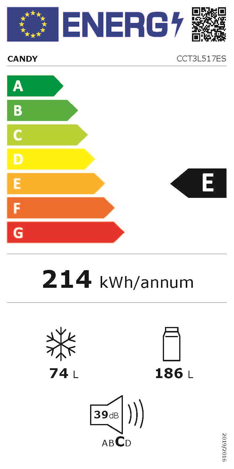 Prostostoječi kombiniran hladilnik Candy CCT3L517ES z zamrzovalnikom spodaj, se uvršča v E energijski razred in ima prostornino 186 l v hladilnem in 74 l v zamrzovalnem predelu. Hladilnik se ponaša s tehnologijo LOW FROST, ki upočasnjuje nastajanje ledu v zamrzovalniku, ima štiri steklene police, predal za sadje in zelenjavo ter tri police na vratih. Zmogljivost zamrzovanja je 3,3 kg/24h. Hladilnik spada v klimatski razred N-ST z glasnostjo delovanja 39 dB. Za dobro preglednost v hladilniku skrbi LED osvetlitev. Izkoristite možnost podaljšanega jamstva Candy na skupno 5 let z registracijo na spletni strani: https://www2.candy.si/jamstvo/.