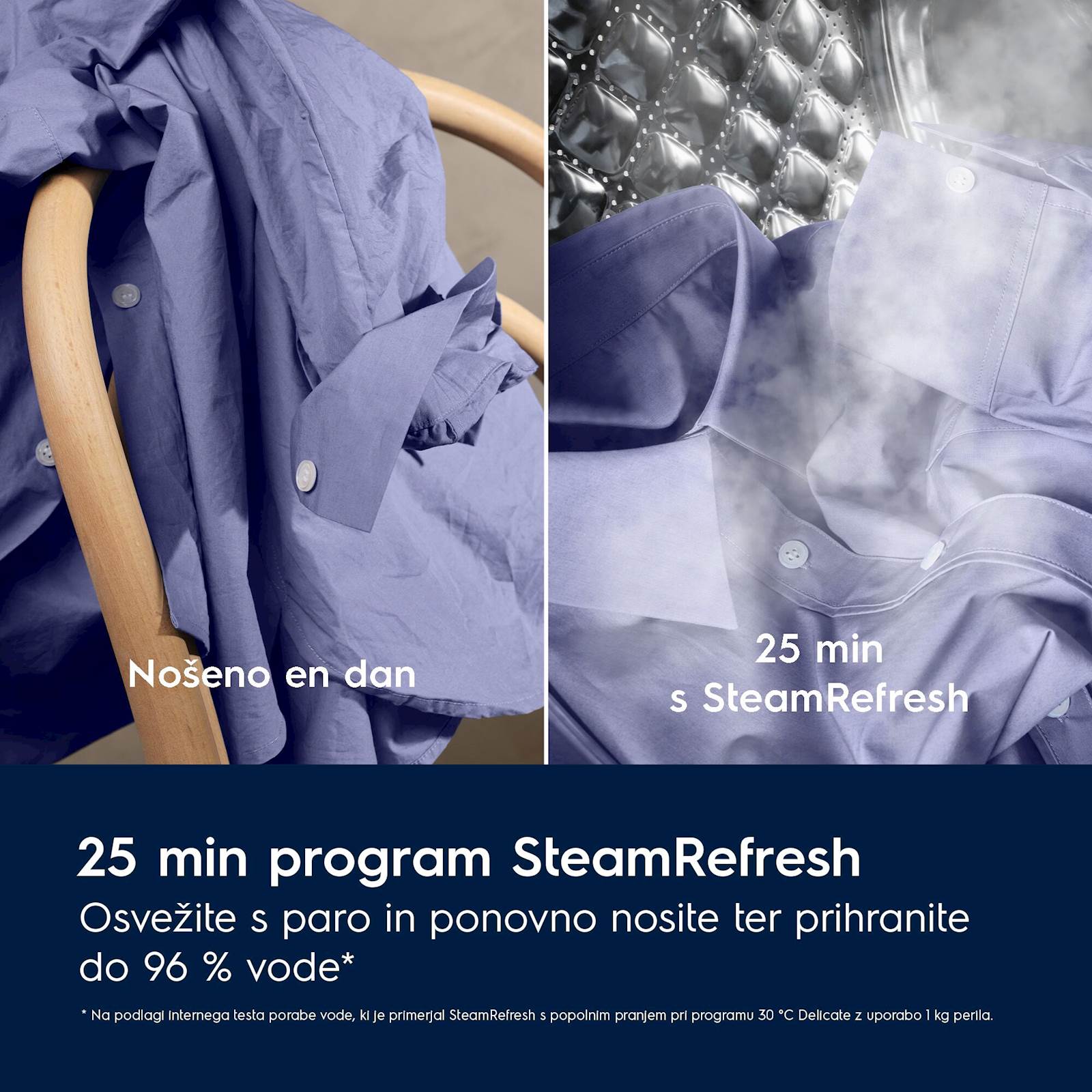 25-minutni program SteamRefresh je primeren za delikatna oblačila in uporabi manj vode od običajnega pranja. Za bolj svež občutek lahko dodate tudi Electrolux Steam Fragrance. DualCare® vam omogoča samozavestno pranje in sušenje. Stroj s certifikatom Woolmark Blue s prilagojeno temperaturo in gibanjem bobna učinkovito opere in posuši tudi jakne in volnene puloverje brez krčenja.*