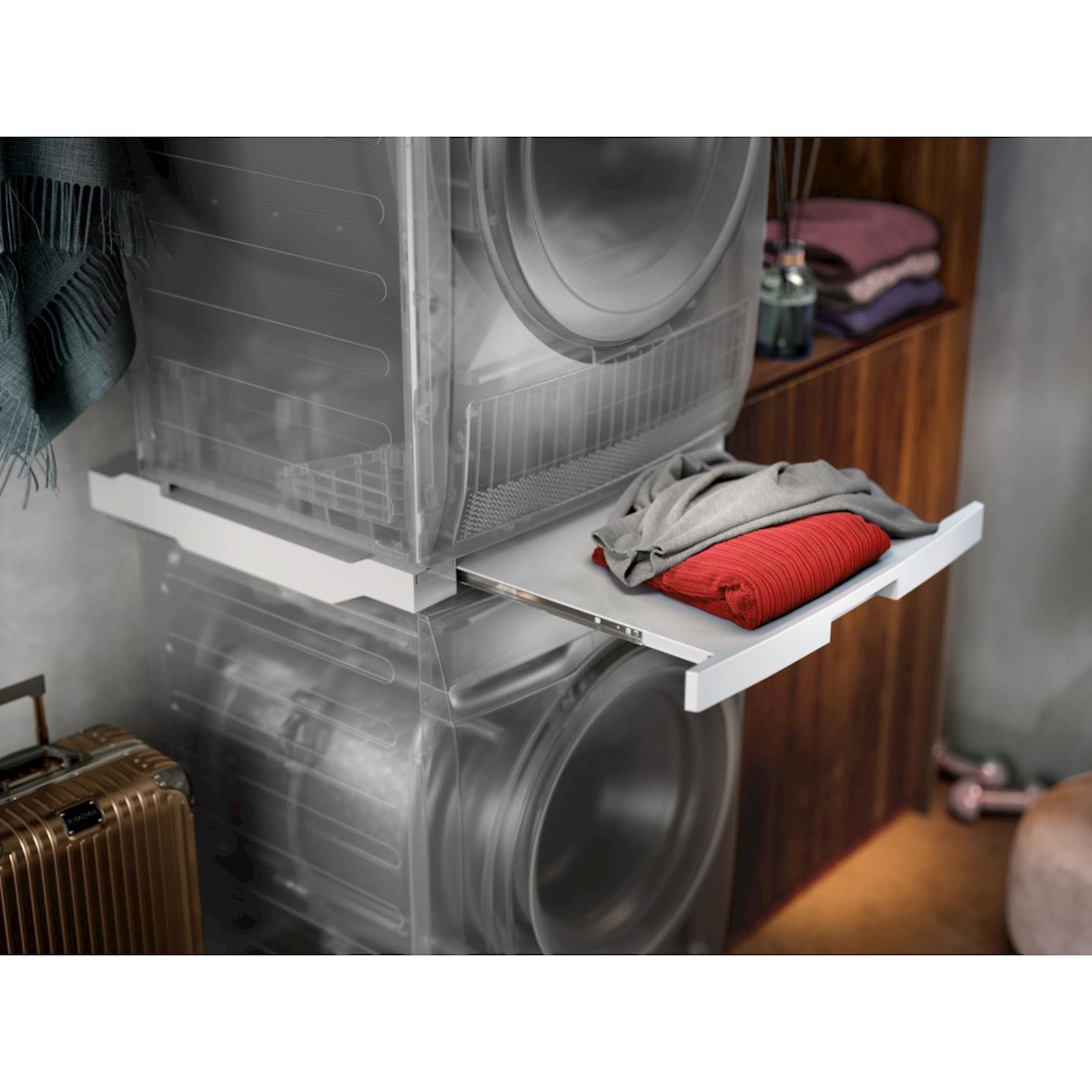 Če je sušilni stroj postavljen na pralni stroj, prihranite prostor. Komplet za namestitev s pomično polico vam omogoča dodaten prostor za ločevanje oblačil, ki jih vzamete iz pralnega stroja ali zlaganje oblačil, ki pridejo iz sušilnega stroja. Večnamenski komplet za namestitev je ustrezen za vse pralne stroje s sprednjim polnjenjem AEG in sušilne stroje AEG, globine od 52 do 67 cm.