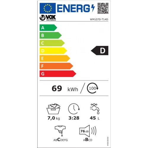 Vox pralni stroj WM 1070-T14D se uvršča v energijski razred D. Odlikuje ga zmogljivost pranja do 7 kg, pri ožemanju pa doseže hitrost do 1000 obratov na minuto. Izbirali boste lahko med 15 programi pranja, prinaša pa tudi širok izbor dodatnih funkcij.